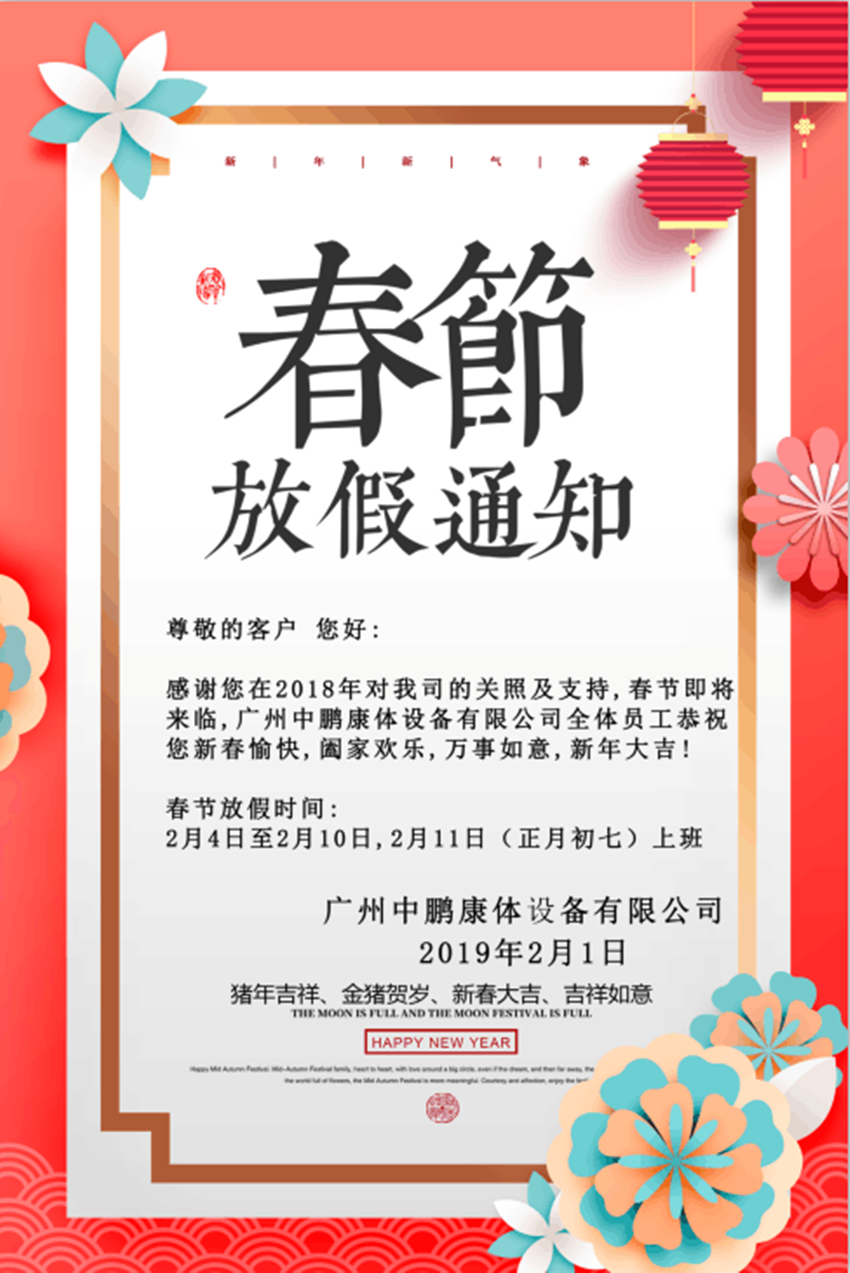 感謝您在2018年對我司的關(guān)照及支持,春節(jié)即將來臨,廣州中鵬康體設(shè)備有限公司全體員工恭祝您新春愉快,闔家歡樂,萬事如意,新年大吉!