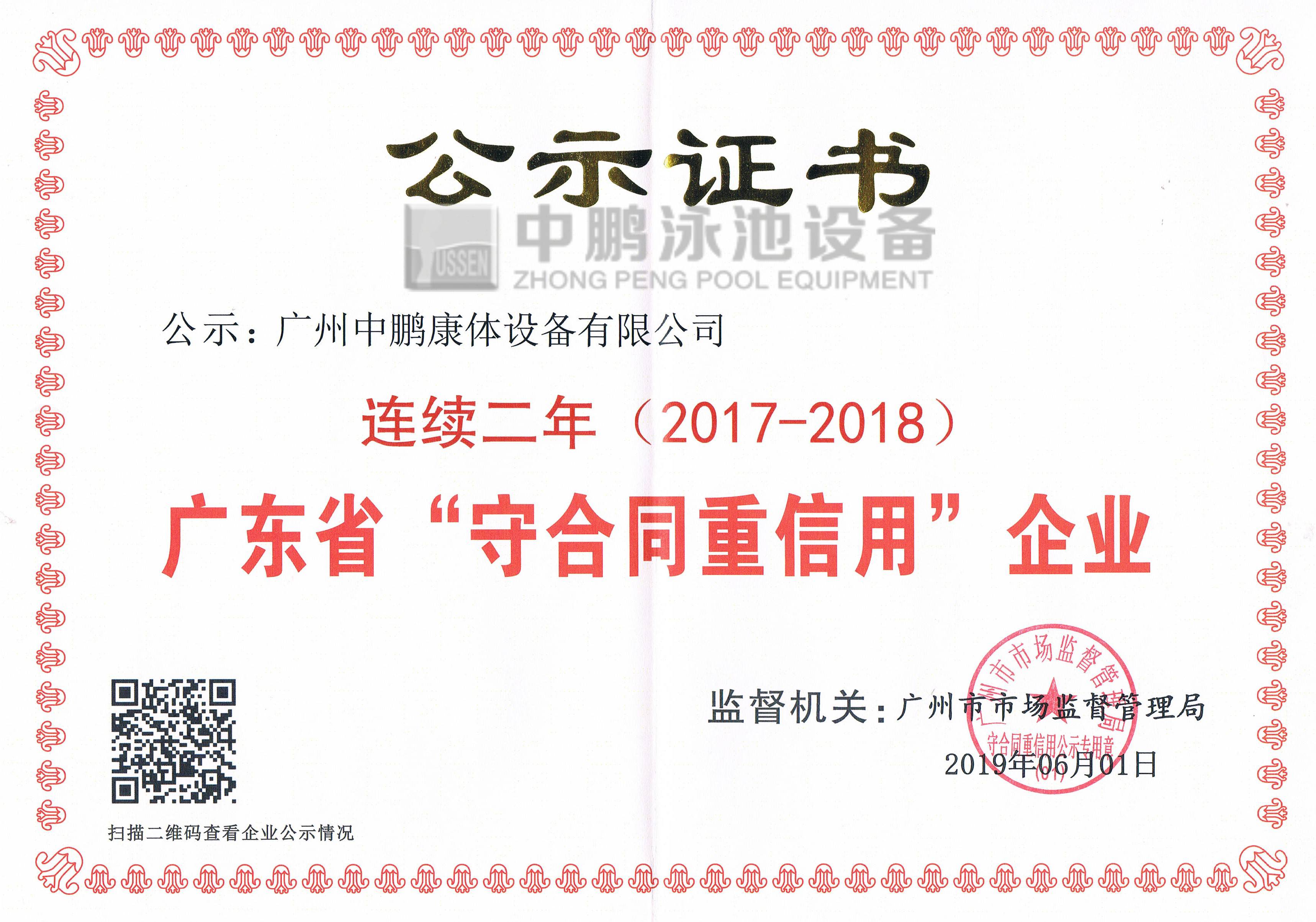 廣州中鵬康體設(shè)備有限公司連續(xù)2年榮獲廣州市工商行政管理局頒發(fā)的“廣東省守合同重信用企業(yè)”榮譽證書和牌匾, 上述連獲榮譽稱號的取得,意味著公司在行業(yè)信用方面取得了政府權(quán)威機(jī)構(gòu)的認(rèn)可,是對公司信用度的肯定,是公司實力的表現(xiàn)。以上榮譽的取得也有助于拓展公司業(yè)務(wù),提高公司業(yè)務(wù)承攬能力,為公司業(yè)績的增長提供支持。同時,擴(kuò)大了公司休閑康體領(lǐng)域的影響,對公司提高綜合競爭并實現(xiàn)長遠(yuǎn)發(fā)展目標(biāo)具有重要戰(zhàn)略意義。